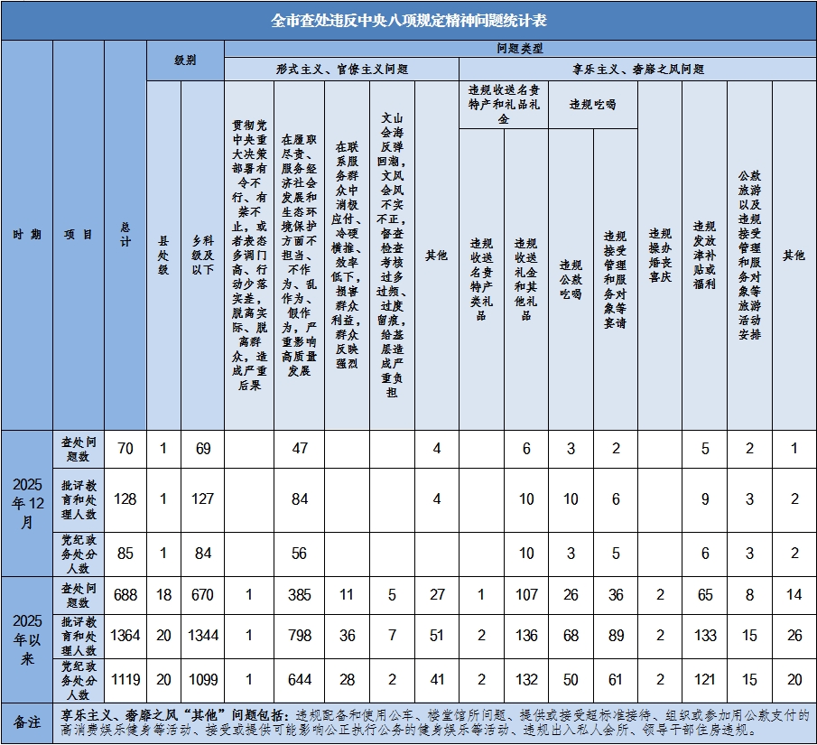 根据中央纪委国家监委、湖南省纪委监委工作部署,怀化市纪委监委认真贯彻落实中央八项规定精神情况月报制度。2025年以来,截至12月31日,全市查处违反中央八项规定精神问题情况如下: