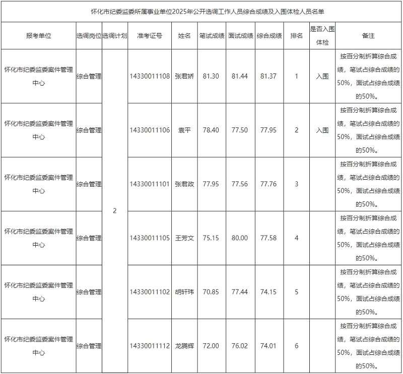 怀化市纪委监委所属事业单位2025年公开选调工作人员综合成绩及入围体检人员的公告