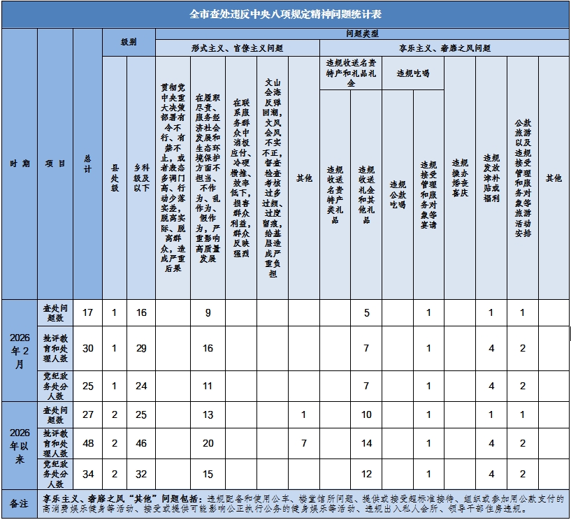 2026年2月,全市各级纪检监察机关共查处违反中央八项规定精神问题17起,批评教育和处理30人,其中给予党纪政务处分25人,占处理人数的83.33%。